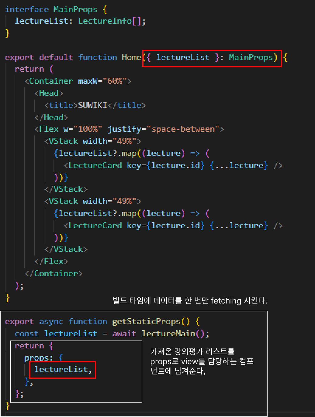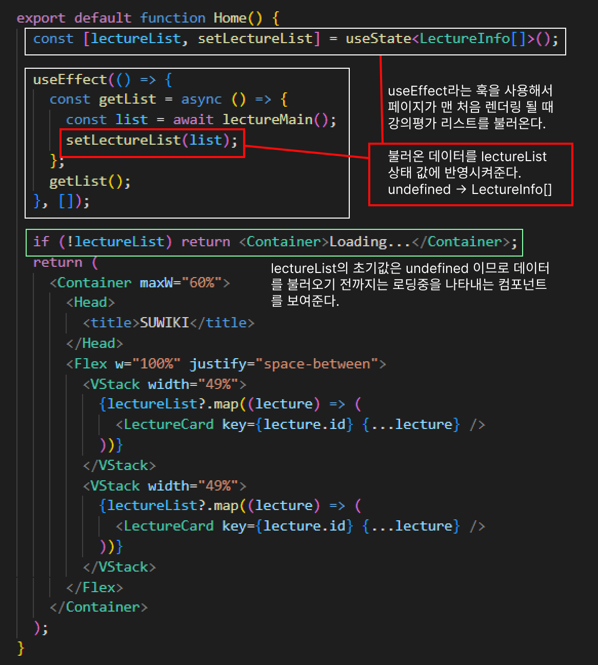 특징 - 강의 평가 데이터를 클라이언트 측에서 요청한다. 브라우저 렌더링 이후에 데이터를 요청하기 때문에 데이터가 state에 들어오기 전까지는 로딩 중임을 나타내는 컴포넌트를 띄워줘야 한다. (UX)