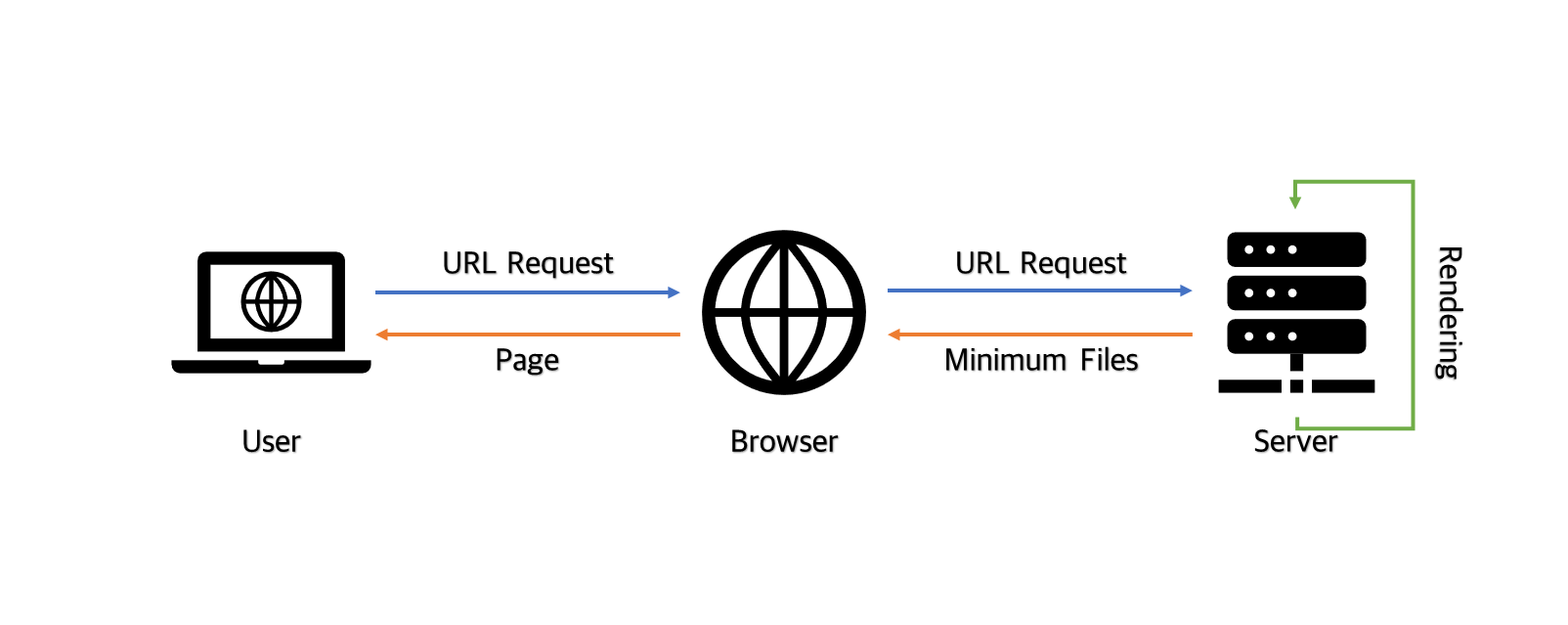 → SSR은 각 URL마다 서버가 요청을 받아, 정의된 로직에 따라 페이지를 렌더링하여 응답하는 방식입니다. 서버가 널널했던 CSR과 달리, SSR에서는 브라우저가 서버에서 제공한 파일을 그대로 표시하고 스크립트를 수행하는 역할 정도가 끝입니다.