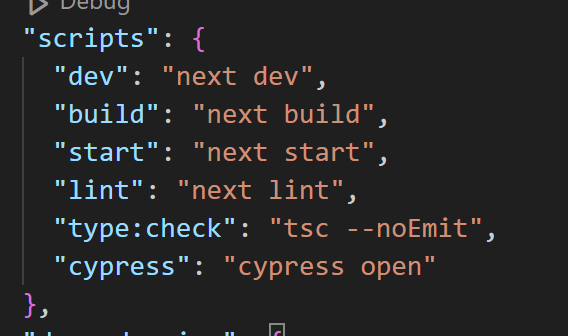 설치가 끝났다면 package.json에서 아래와 같이 Cypress 실행 스크립트를 추가해준다.